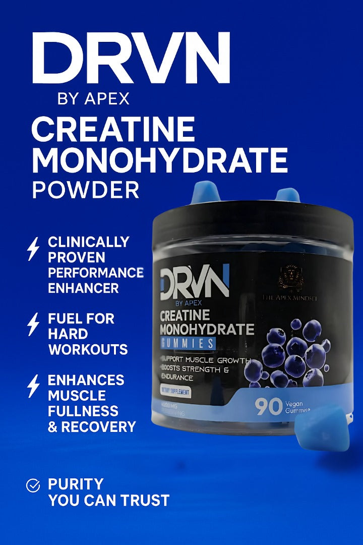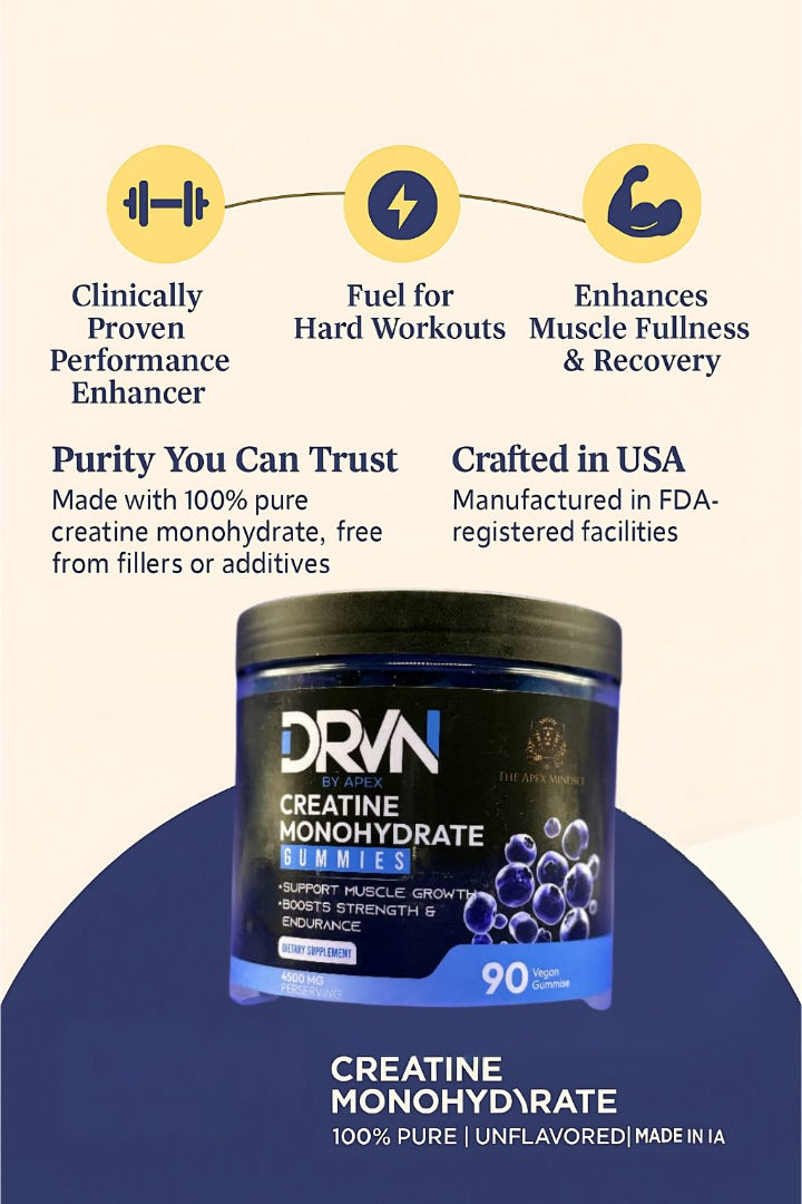 Unlock peak performance with DRVN by Apex Creatine Monohydrate Gummies. Made with 100% pure creatine, these vegan-friendly gummies help boost strength, endurance, and muscle recovery — with no fillers or additives. Manufactured in FDA-registered facilities right here in the USA, it's clean fuel you can trust for serious results.