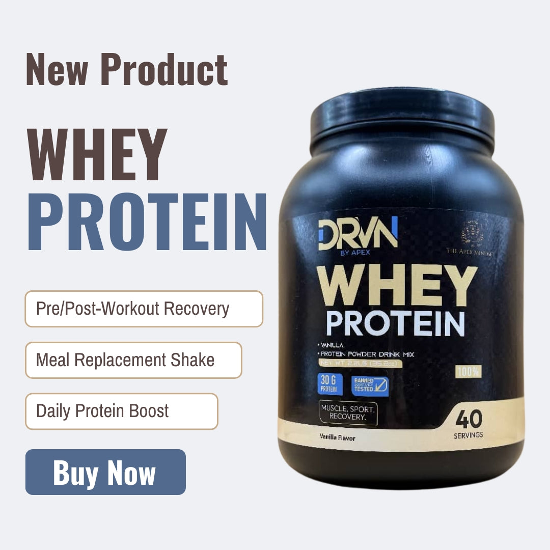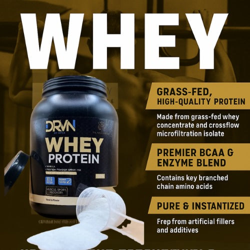 Whether you're powering through a tough workout or need a quick, nutritious meal replacement, DRVN Whey Protein delivers 30g of high-quality protein per serving. Ideal for athletes, fitness enthusiasts, or anyone needing a daily protein boost. Formulated for taste and tested for purity—because you deserve results you can trust.